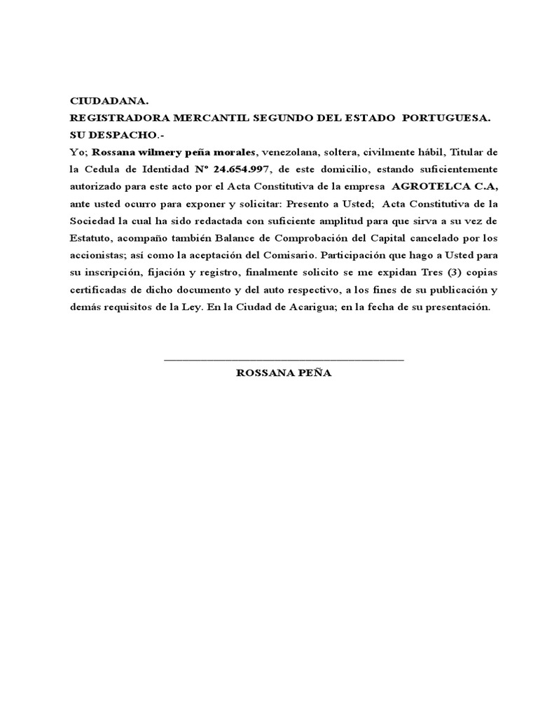 Yo; Rossana wilmery peña morales, venezolana, soltera, civilmente hábil, Titular de