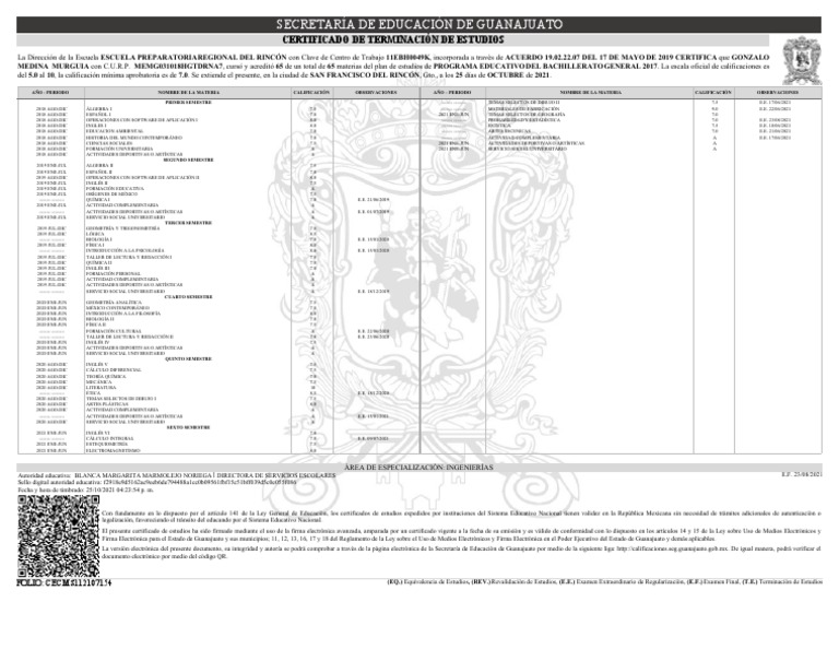 MEDINA MURGUIA con C.U.R.P. MEMG031018HGTDRNA7, cursó y acreditó 65 de un total de 65 materias del plan de estudios de PROGRAMA EDUCATIVO DEL BACHILLERATO GENERAL 2017. La escala oficial de calificaciones es