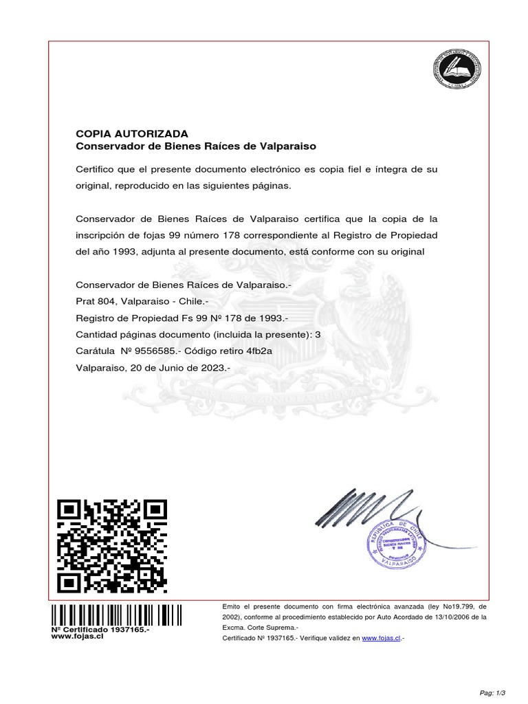 Conservador de Bienes Raíces de Valparaiso certifica que la copia de la