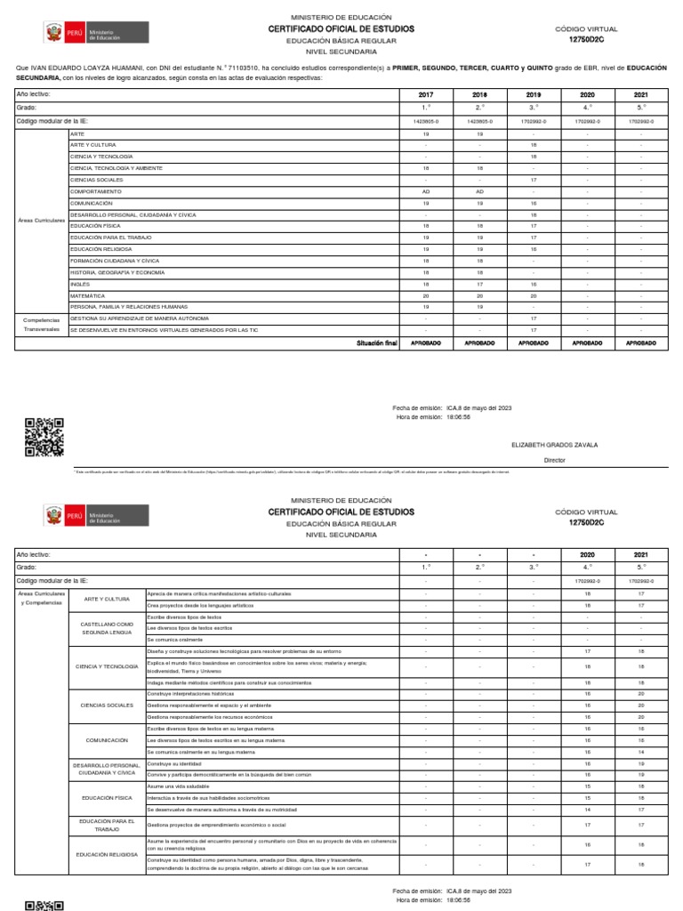 Que IVAN EDUARDO LOAYZA HUAMANI, con DNI del estudiante N.° 71103510, ha concluido estudios correspondiente(s) a PRIMER, SEGUNDO, TERCER, CUARTO y QUINTO grado de EBR, nivel de EDUCACIÓN