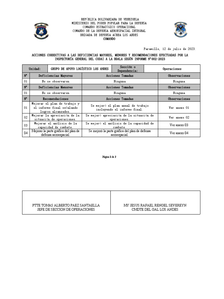 Nº Recomendaciones Acciones Tomadas Observaciones