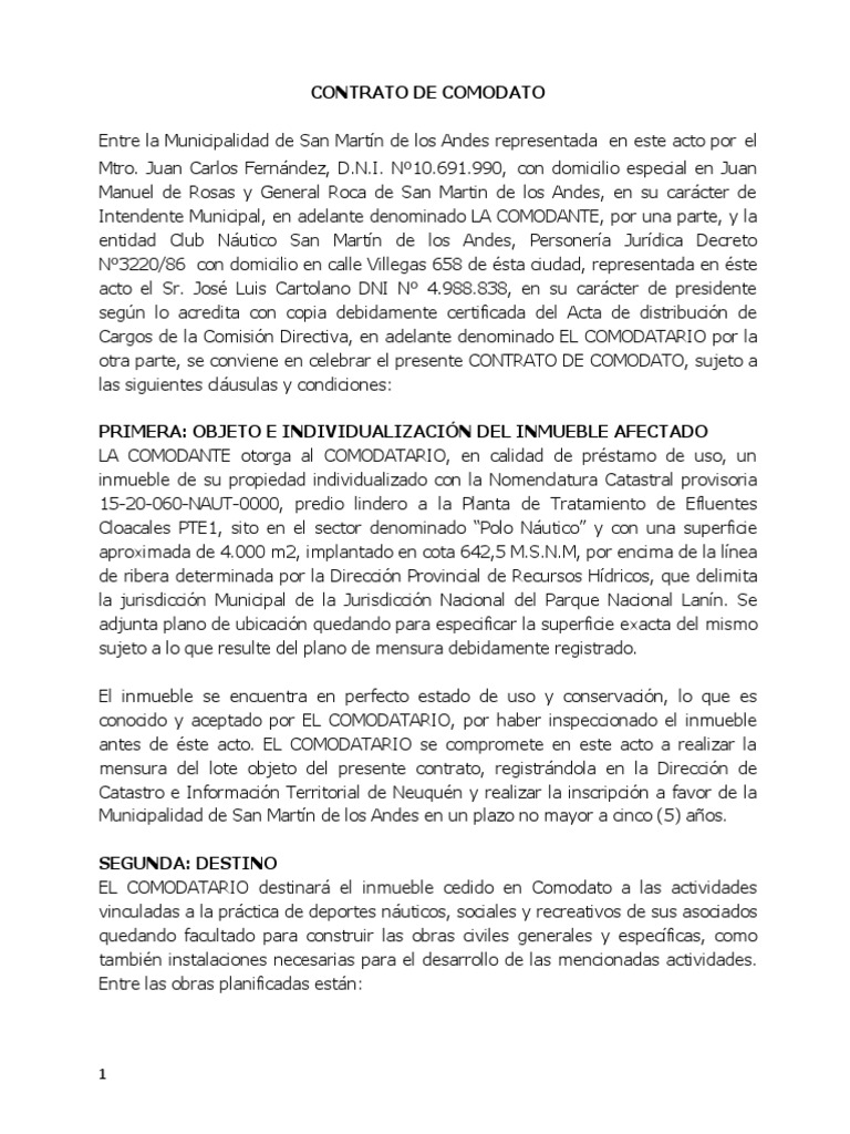 Intendente Municipal, en adelante denominado LA COMODANTE, por una parte, y la