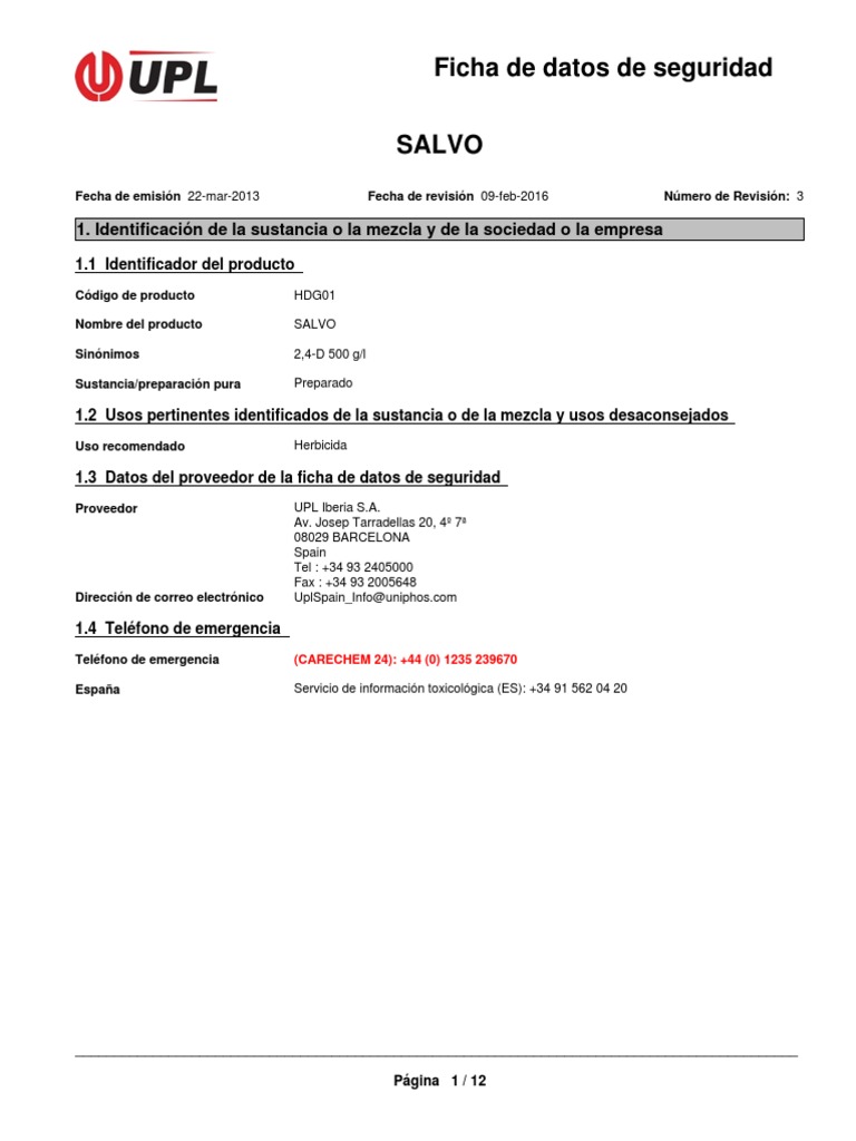 Teléfono de emergencia (CARECHEM 24): +44 (0) 1235 239670
