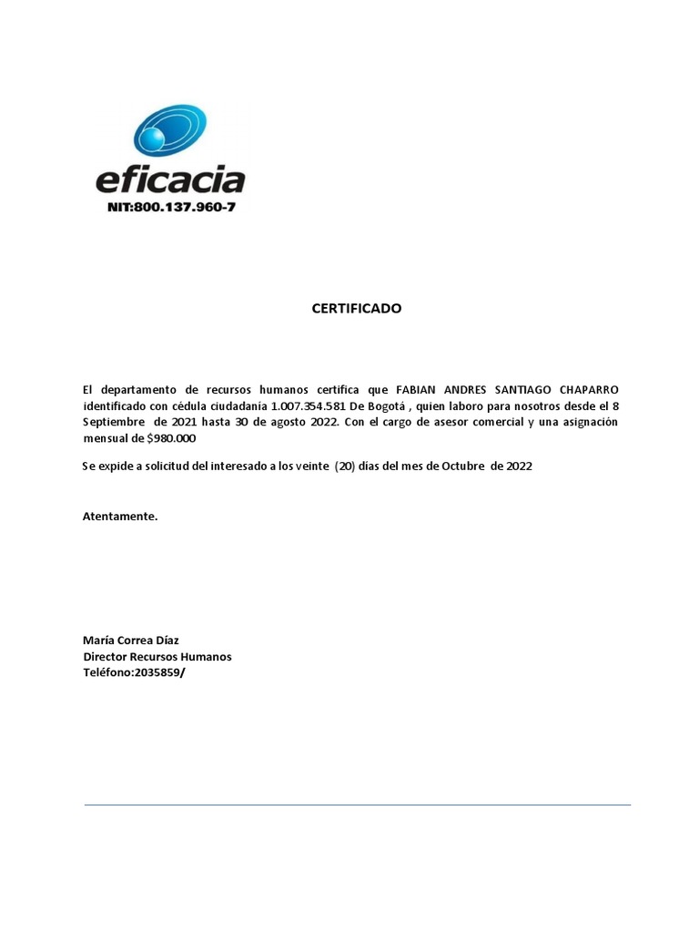 El departamento de recursos humanos certifica que FABIAN ANDRES SANTIAGO CHAPARRO