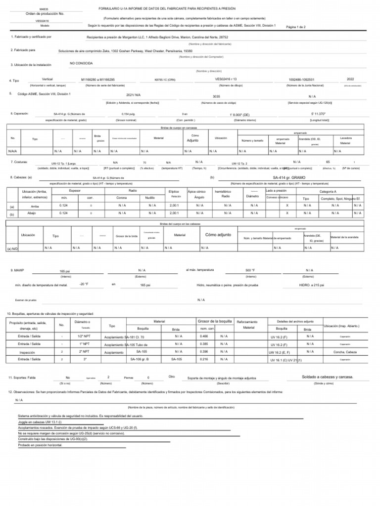 1. Fabricado y certificado por Recipientes a presión de Morganton LLC, 1 Alfredo Baglioni Drive, Marion, Carolina del Norte, 28752