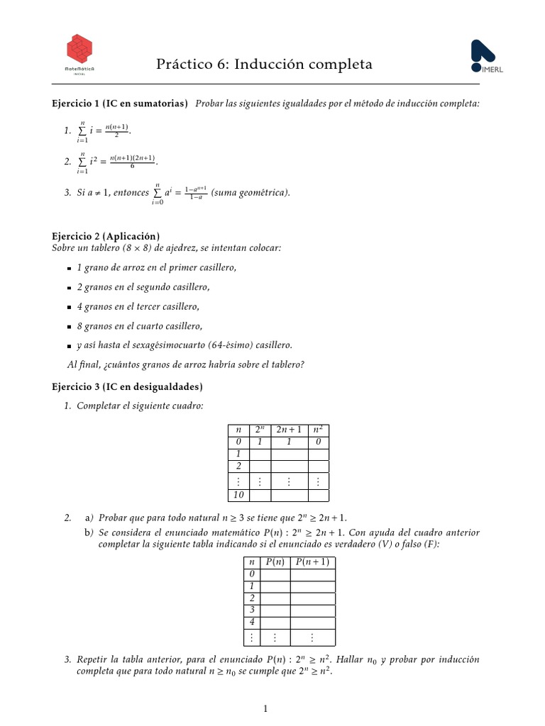 Ejercicio 1 (IC en sumatorias) Probar las siguientes igualdades por el método de inducción completa: