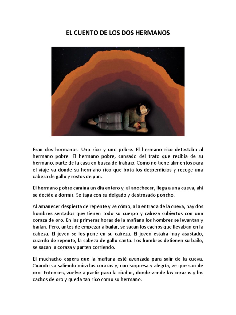El hermano pobre camina un día entero y, al anochecer, llega a una cueva, ahí