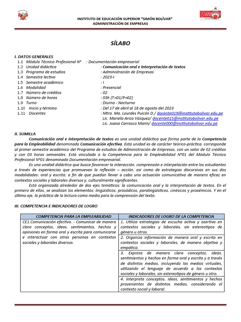 1.11 Docentes : Mtra. Ma. Lourdes Puicón D./ docente019@institutobolivar.edu.pe