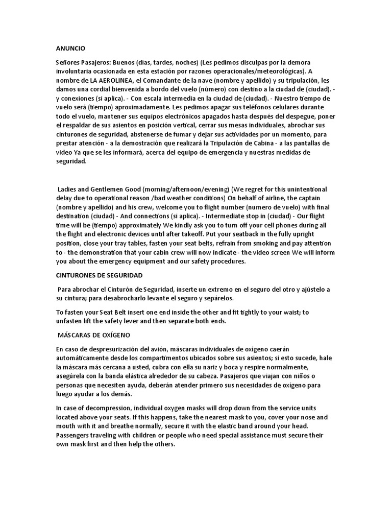 (nombre y apellido) and his crew, welcome you to flight number (numero de vuelo) with final