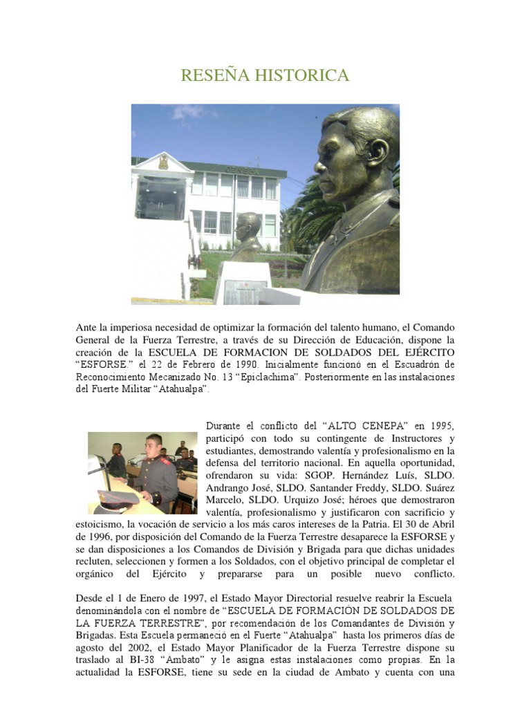 Ante la imperiosa necesidad de optimizar la formacin del talento humano, el Comando General de la Fuerza Terrestre, a travs de su Direccin de Educacin, dispone la creacin de la ESCUELA DE FORMACION DE SOLDADOS DEL EJRCITO ESFORSE. el 22 de Febrero de 1990. Inicialmente funcion en el Escuadrn de Reconocimiento Mecanizado No. 13 Epiclachima. Posteriormente en las instalaciones del Fuerte Militar Atahualpa. Durante el conflicto del ALTO CENEPA en 1995, particip con todo su contingente de Instructores y estudiantes, demostrando valenta y profesionalismo en la defensa del territorio nacional. En aquella oportunidad, ofrendaron su vida: SGOP. Hernndez Lus, SLDO. Andrango Jos, SLDO. Santander Freddy, SLDO. Surez Marcelo, SLDO. Urquizo Jos; hroes que demostraron valenta, profesionalismo y justificaron con sacrificio y estoicismo, la vocacin de servicio a los ms caros intereses de la Patria. El 30 de Abril de 1996, por disposicin del Comando de la Fuerza Terrestre desaparece la ESFORSE y se dan disposiciones a los Comandos de Divisin y Brigada para que dichas unidades recluten, seleccionen y formen a los Soldados, con el objetivo principal de completar el orgnico del Ejrcito y prepararse para un posible nuevo conflicto. Desde el 1 de Enero de 1997, el Estado Mayor Directorial resuelve reabrir la Escuela denominndola con el nombre de ESCUELA DE FORMACIN DE SOLDADOS DE LA FUERZA TERRESTRE, por recomendacin de los Comandantes de Divisin y Brigadas. Esta Escuela permaneci en el Fuerte Atahualpa hasta los primeros das de agosto del 2002, el Estado Mayor Planificador de la Fuerza Terrestre dispone su traslado al BI-38 Ambato y le asigna estas instalaciones como propias. En la actualidad la ESFORSE, tiene su sede en la ciudad de Ambato y cuenta con una