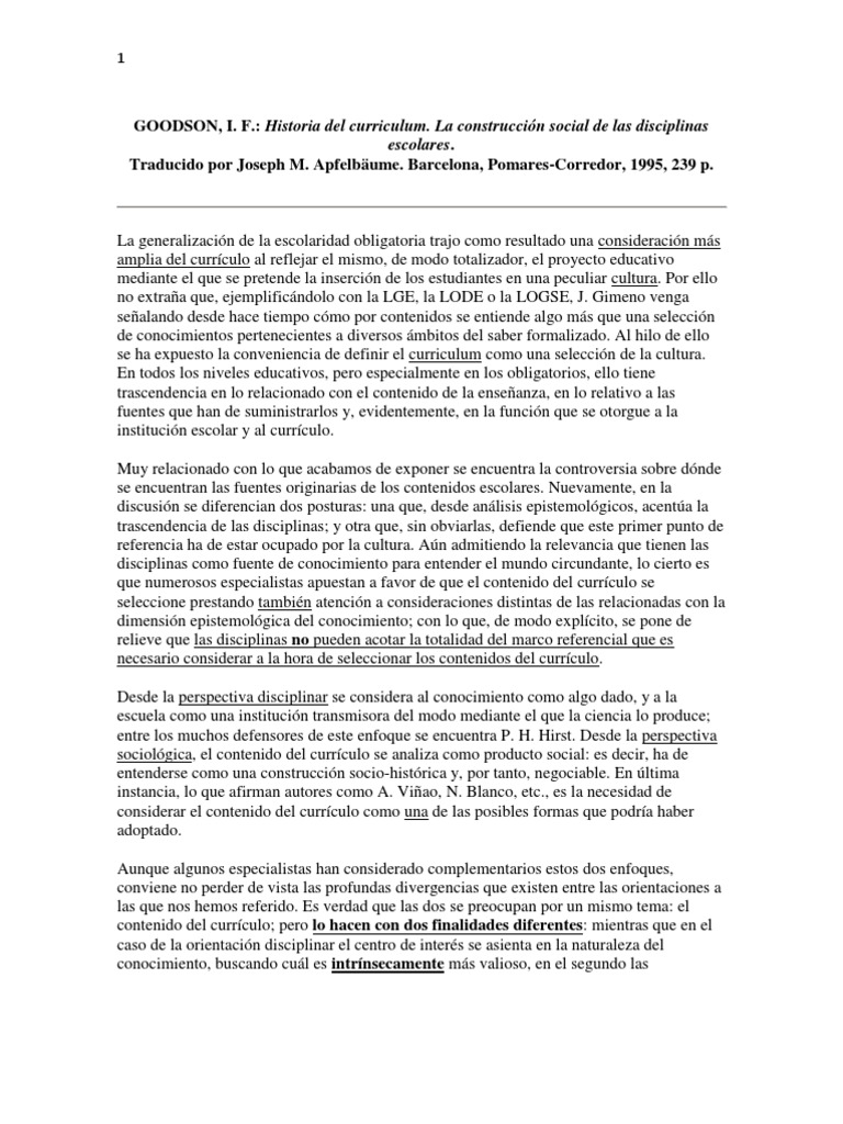 GOODSON, I. F.: Historia del curriculum. La construccin social de las disciplinas escolares. Traducido por Joseph M. Apfelbume. Barcelona, Pomares-Corredor, 1995, 239 p.