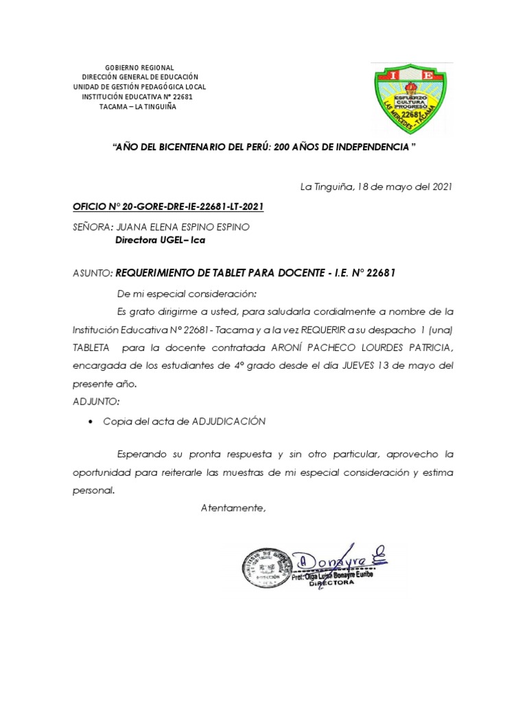Institución Educativa N° 22681- Tacama y a la vez REQUERIR a su despacho 1 (una)