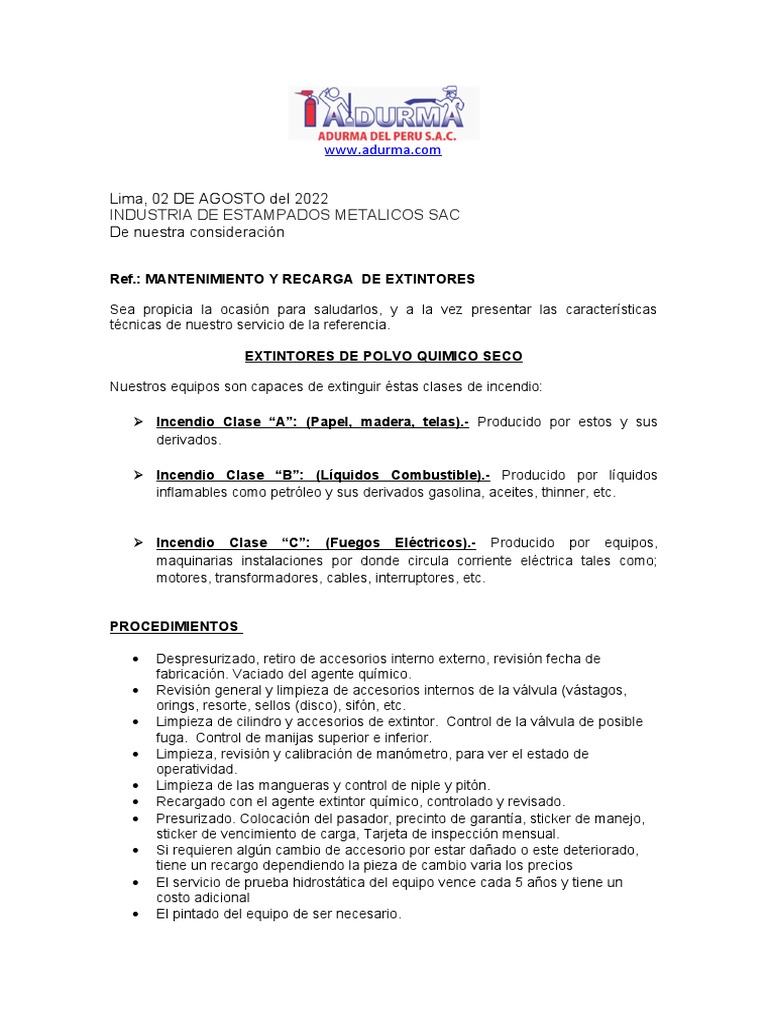 MANTENIMIENTO Y RECARGA PQS-ABC 12KG S/60.00 S/120.00