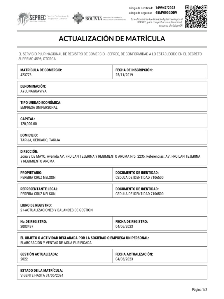 EL SERVICIO PLURINACIONAL DE REGISTRO DE COMERCIO - SEPREC, DE CONFORMIDAD A LO ESTABLECIDO EN EL DECRETO