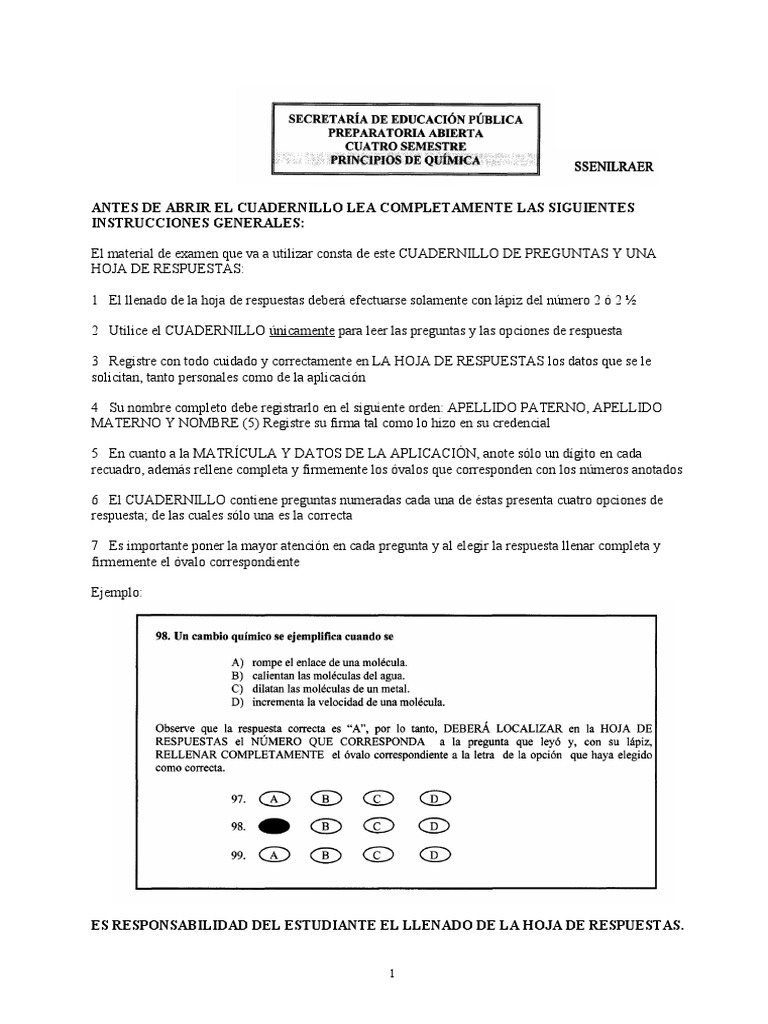 1 El llenado de la hoja de respuestas deberá efectuarse solamente con lápiz del número 2 ó 2 ½