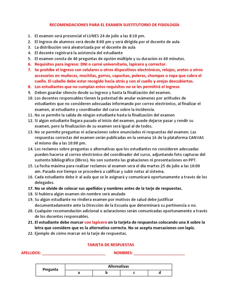 RECOMENDACIONES PARA EL EXAMEN SUSTITUTORIO DE FISIOLOGÍA