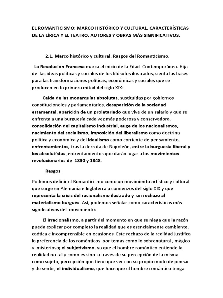 2.1. Marco histórico y cultural. Rasgos del Romanticismo.