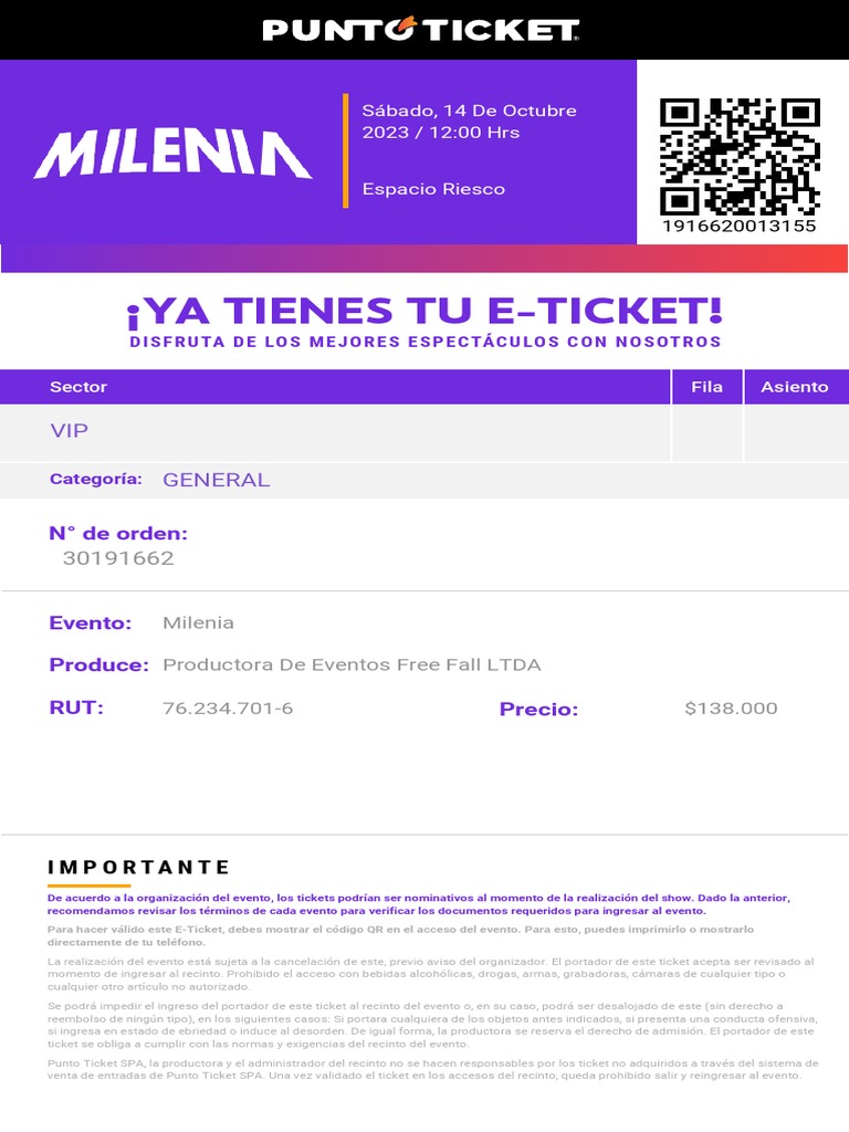 venta de entradas de Punto Ticket SPA. Una vez validado el ticket en los accesos del recinto, queda prohibido salir y reingresar al evento.