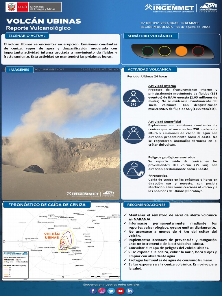 El volcán Ubinas se encuentra en erupción. Emisiones constantes