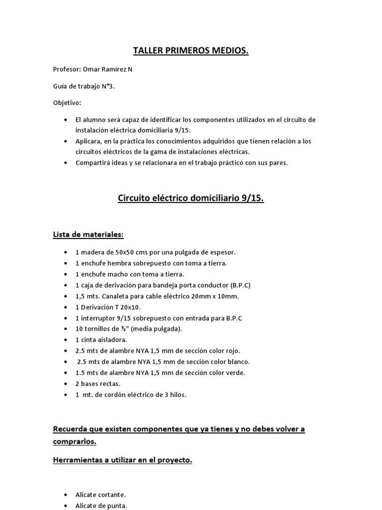 Profesor: Omar Ramrez N Gua de trabajo N3. Objetivo: El alumno ser capaz de identificar los componentes utilizados en el circuito de instalacin elctrica domiciliaria 9/15. Aplicara, en la prctica los conocimientos adquiridos que tienen relacin a los circuitos elctricos de la gama de instalaciones elctricas. Compartir ideas y se relacionara en el trabajo prctico con sus pares.