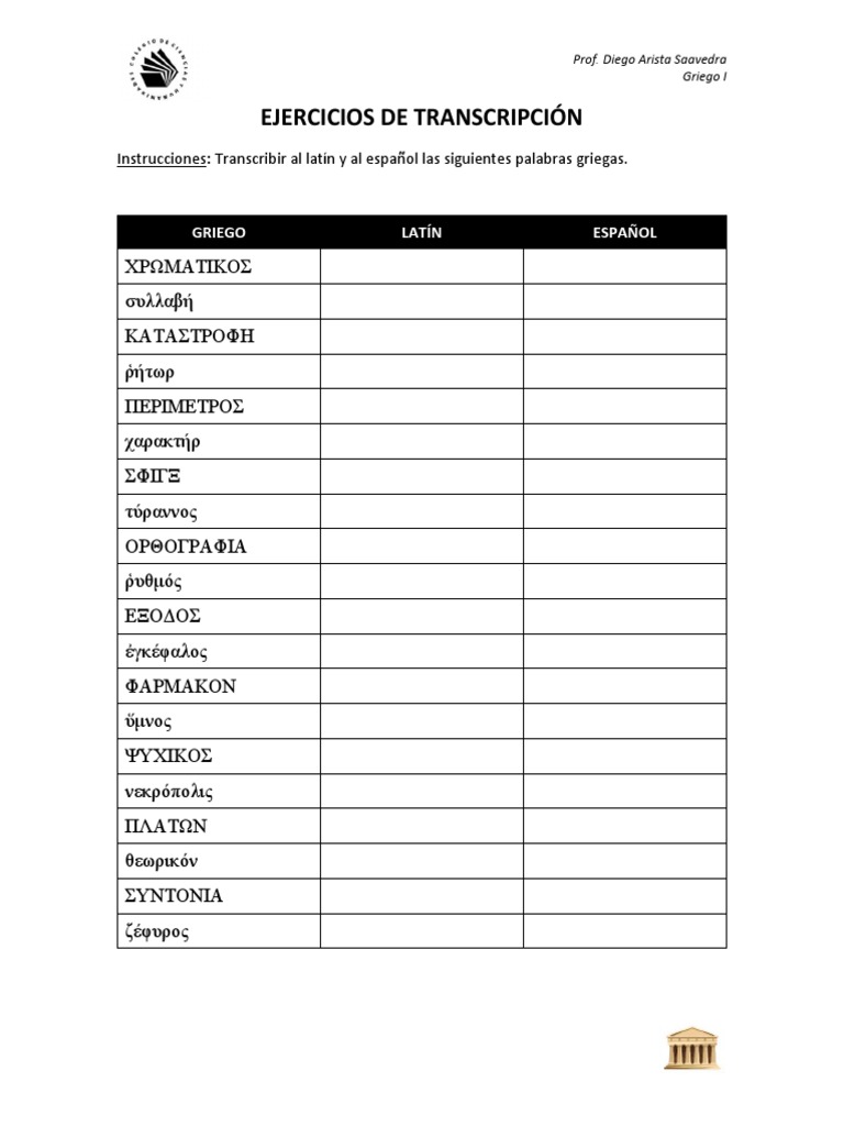 Instrucciones: Transcribir al latín y al español las siguientes palabras griegas.