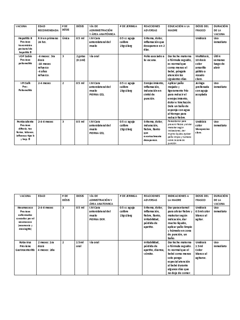 Pentavalente 2-4-6 meses 3 0.5 ml I.M Cara 0.5 cc aguja Eritema, dolor, Paracetamol para Unidósis Uso