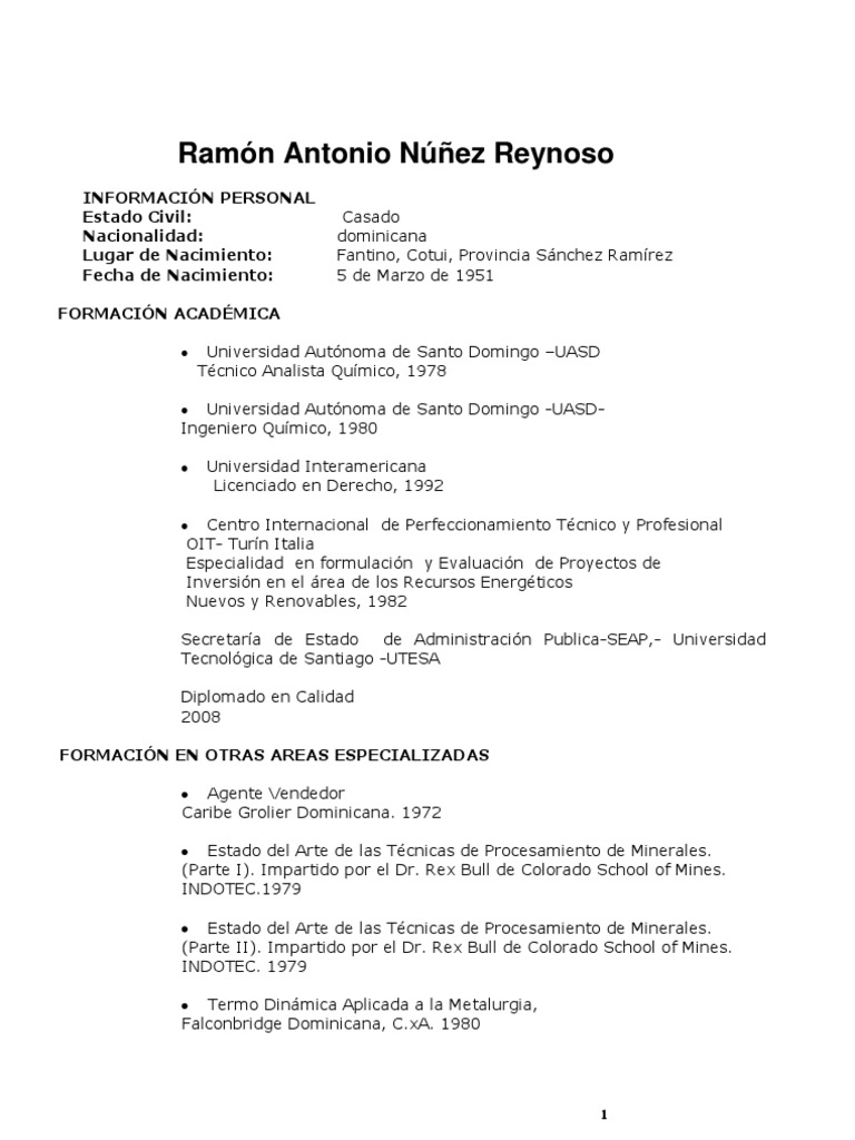 INFORMACIN PERSONAL Estado Civil: Nacionalidad: Lugar de Nacimiento: Fecha de Nacimiento: FORMACIN ACADMICA Universidad Autnoma de Santo Domingo UASD Tcnico Analista Qumico, 1978 Universidad Autnoma de Santo Domingo -UASDIngeniero Qumico, 1980 Universidad Interamericana Licenciado en Derecho, 1992 Centro Internacional de Perfeccionamiento Tcnico y Profesional OIT- Turn Italia Especialidad en formulacin y Evaluacin de Proyectos de Inversin en el rea de los Recursos Energticos Nuevos y Renovables, 1982 Secretara de Estado de Administracin Publica-SEAP,- Universidad Tecnolgica de Santiago -UTESA Diplomado en Calidad 2008 FORMACIN EN OTRAS AREAS ESPECIALIZADAS Agente Vendedor Caribe Grolier Dominicana. 1972 Estado del Arte de las Tcnicas de Procesamiento de Minerales. (Parte I). Impartido por el Dr. Rex Bull de Colorado School of Mines. INDOTEC.1979 Estado del Arte de las Tcnicas de Procesamiento de Minerales. (Parte II). Impartido por el Dr. Rex Bull de Colorado School of Mines. INDOTEC. 1979 Termo Dinmica Aplicada a la Metalurgia, Falconbridge Dominicana, [Link]. 1980 Casado dominicana Fantino, Cotui, Provincia Snchez Ramrez 5 de Marzo de 1951