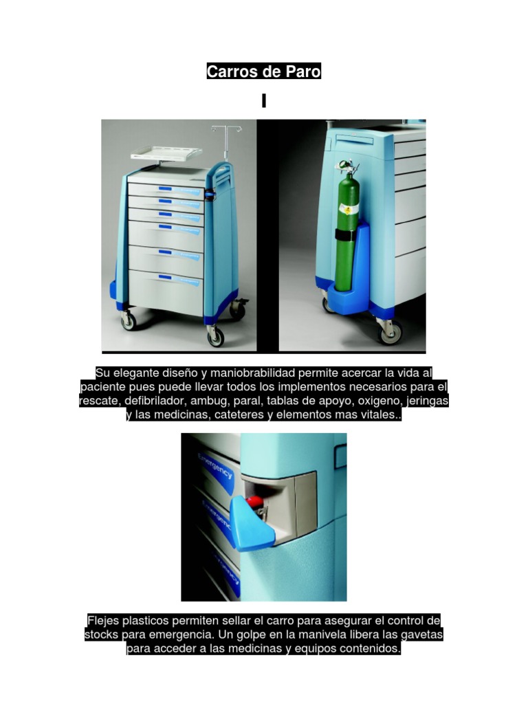 EL CARRO DE PARO :es uno de los elementos indispensable en toda rea en donde se manejen pacientes o se realicen procedimientos, no existe un protocolo nico para armar el carro y este depender del tipo de servicio y condiciones de gravedad de los pacientes, pero cada servicio se adaptar a sus necesidades y requerimientos. Aqu describir un carro de paro orientado a un paciente adulto en una unidad crtica.