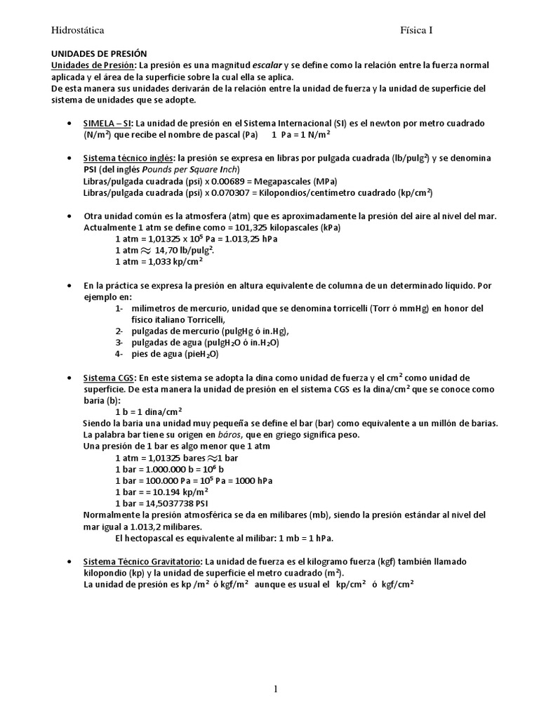 Unidades de Presión: La presión es una magnitud escalar y se define como la relación entre la fuerza normal