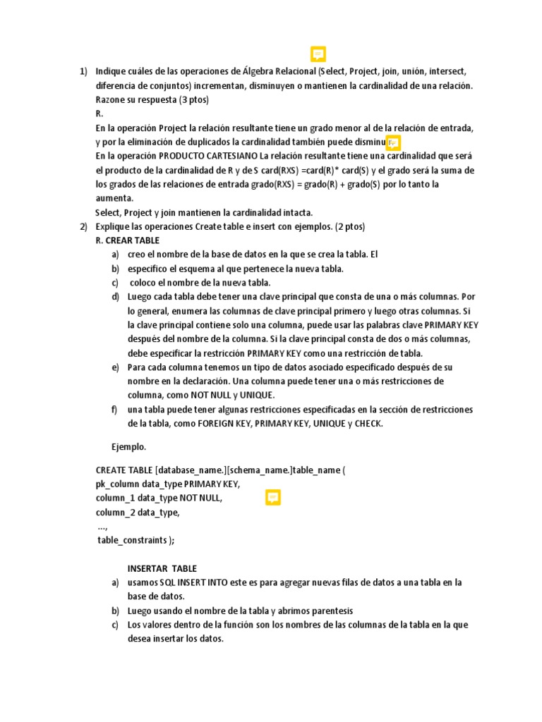 2) Explique las operaciones Create table e insert con ejemplos. (2 ptos)