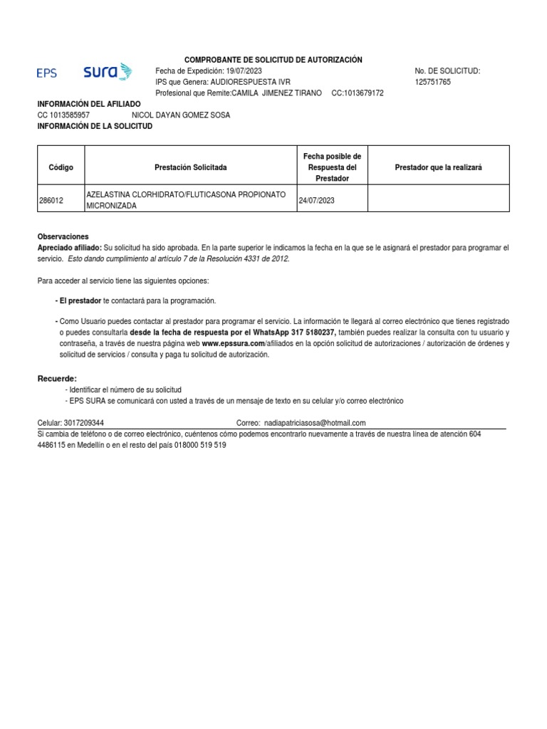 - EPS SURA se comunicará con usted a través de un mensaje de texto en su celular y/o correo electrónico