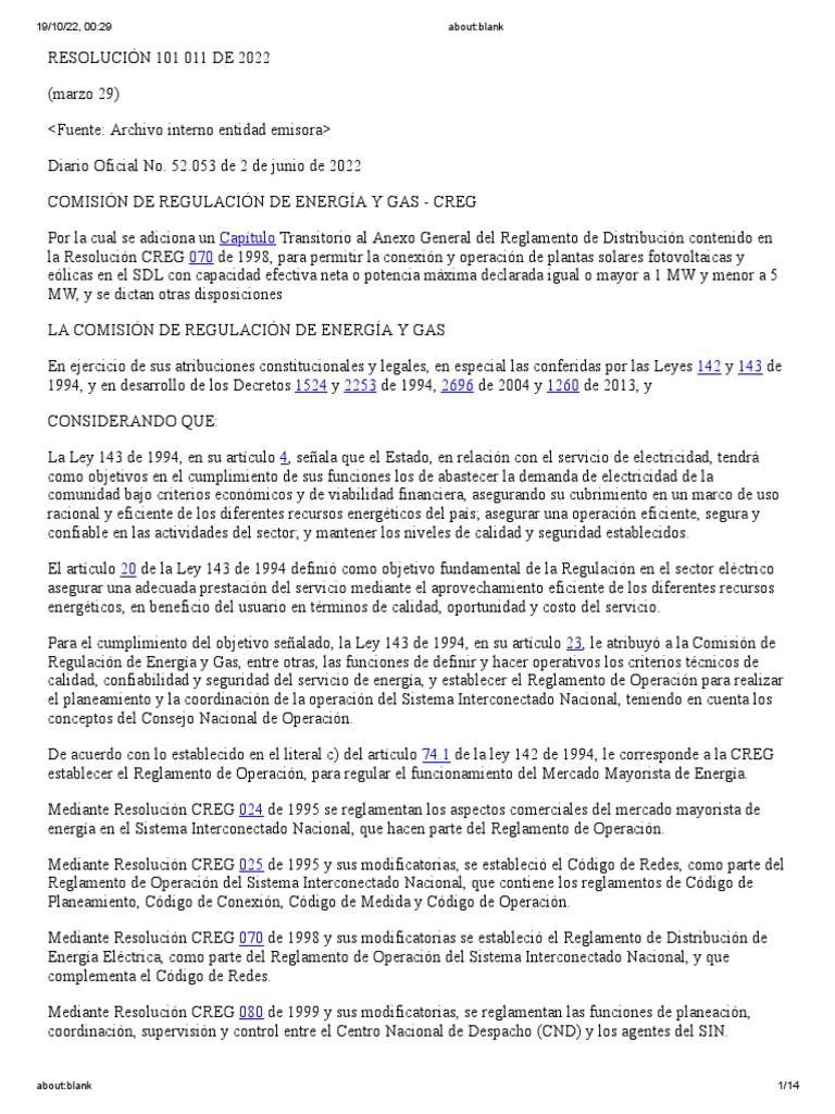 Posteriormente, mediante Resolución CREG 101 005 de 2022 se realizó un ajuste a la transición de la