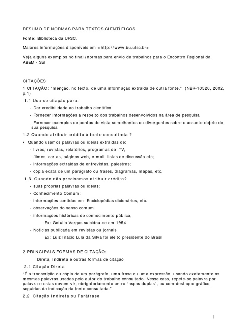 Citaes As citaes diretas (literais) curtas (com at trs linhas) devem ser inseridas no texto e colocadas entre aspas, seguidas da referncia entre parnteses, com sobrenome(s) do(s) autor(es), ano e pgina(s) (ver exemplos abaixo). As citaes diretas longas (com mais de trs linhas) devem ser colocadas em pargrafo separado, justificado, utilizando espao simples, fonte tamanho 11, e no devem ser colocadas entre aspas. Essas citaes devem ser seguidas da referncia entre parnteses, com sobrenome(s) do(s) autor(es), ano e pgina(s) (ver exemplos abaixo). As citaes indiretas (no literais) devem ser inseridas no texto, mas no devem ser colocadas entre aspas, e so seguidas da referncia entre parnteses, com sobrenome(s) do(s) autor(es), ano e pgina(s). Observar que as pginas s devem ser colocadas caso a citao se refira a trecho(s) especfico(s) e no obra como um todo (ver exemplos abaixo). No caso de citaes de obras em lngua estrangeira, estas devem ser traduzidas (caso se considere necessrio, o trecho na lngua original pode ser apresentado em nota de rodap). Exemplos das referncias em citaes entre parnteses: - uma obra, com um autor (GREEN, 2002, p. 25) - uma obra, com dois autores (ou trs): (FERREIRA; GUIMARES, 2003, p. 22) - uma obra, com mais de trs autores: (MOURA et al., 2002, p. 15-17) - duas obras, com mesmo autor: (TURINO, 1992, p. 51-52, 1999, p. 13) - duas obras, com autores diferentes: