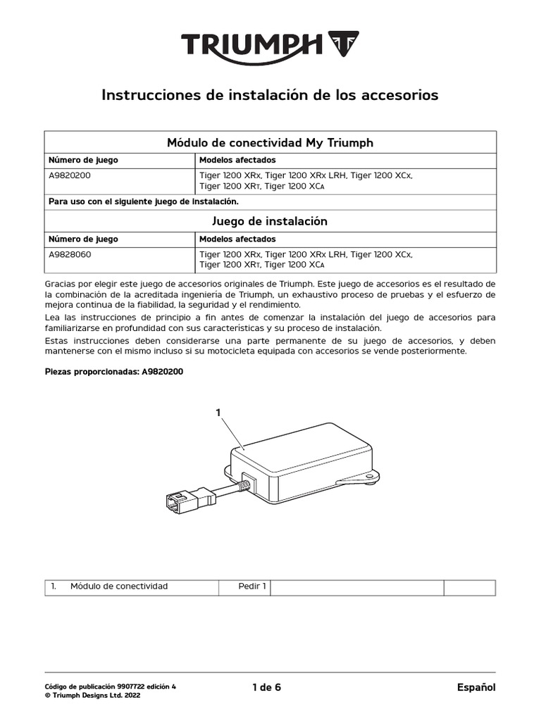Gracias por elegir este juego de accesorios originales de Triumph. Este juego de accesorios es el resultado de