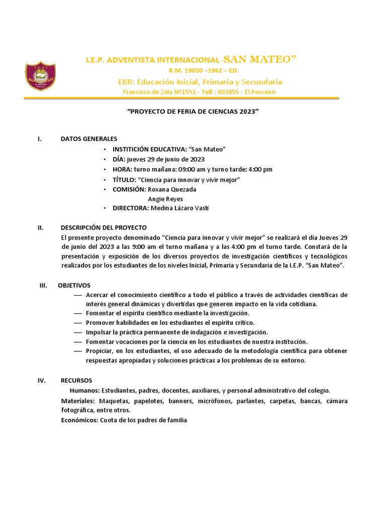 El presente proyecto denominado “Ciencia para innovar y vivir mejor” se realizará el día Jueves 29