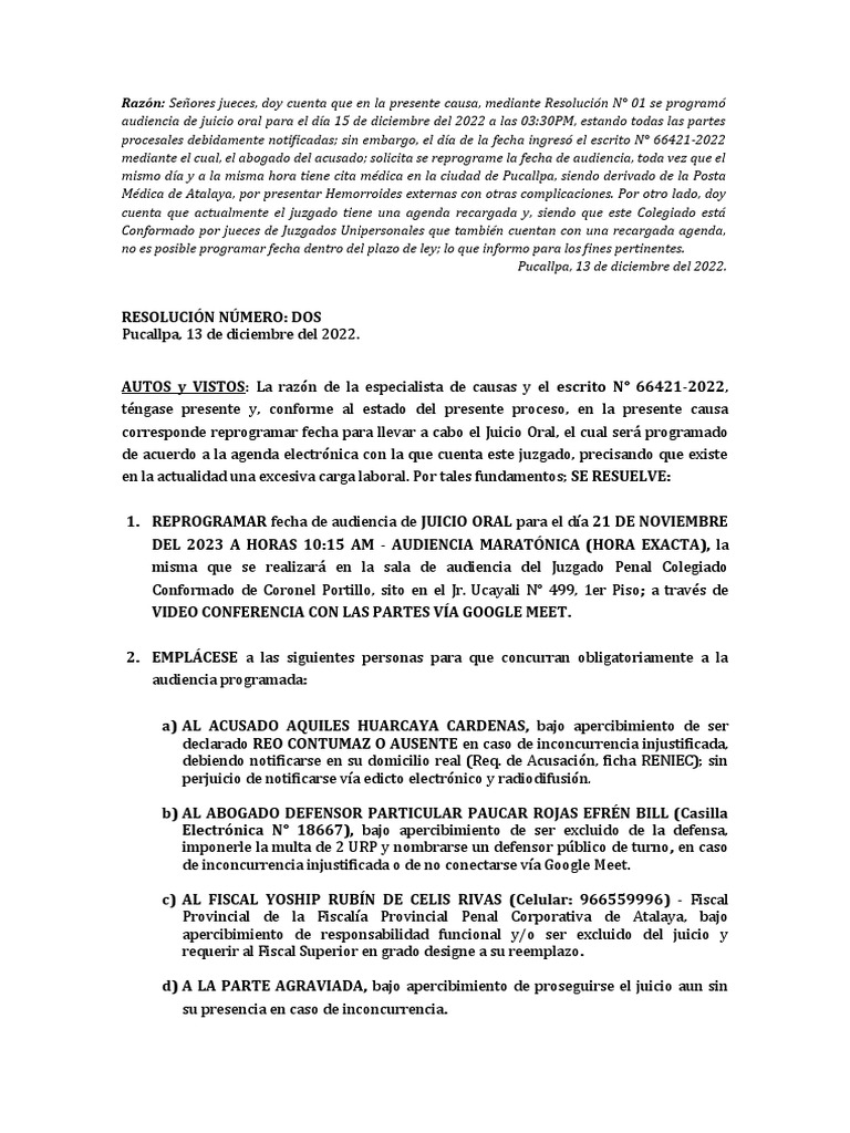 audiencia de juicio oral para el día 15 de diciembre del 2022 a las 03:30PM, estando todas las partes