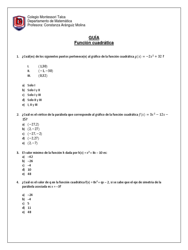 1. ¿Cuál(es) de los siguientes puntos pertenece(n) al gráfico de la función cuadrática 𝑔(𝑥) = −2𝑥 2 + 32 ?