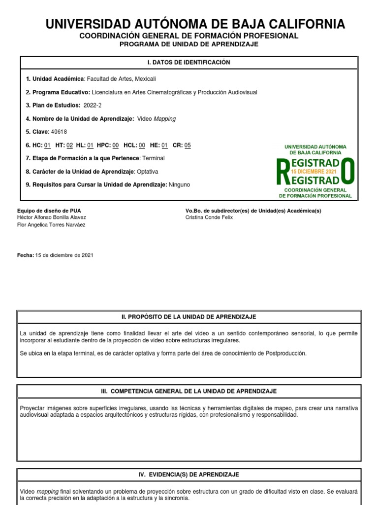 El docente que imparta la unidad de aprendizaje de Video Mapping, debe contar con un título de Licenciado en Medios