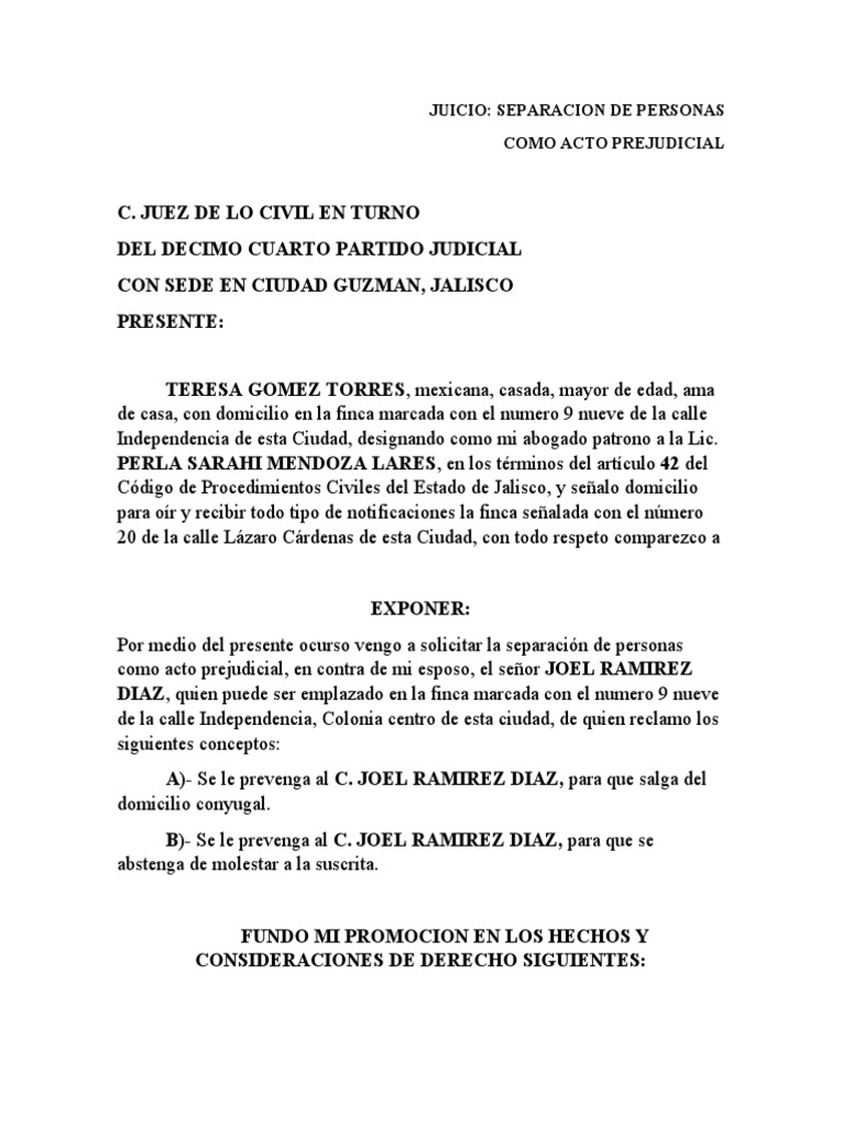 Por medio del presente ocurso vengo a solicitar la separación de personas