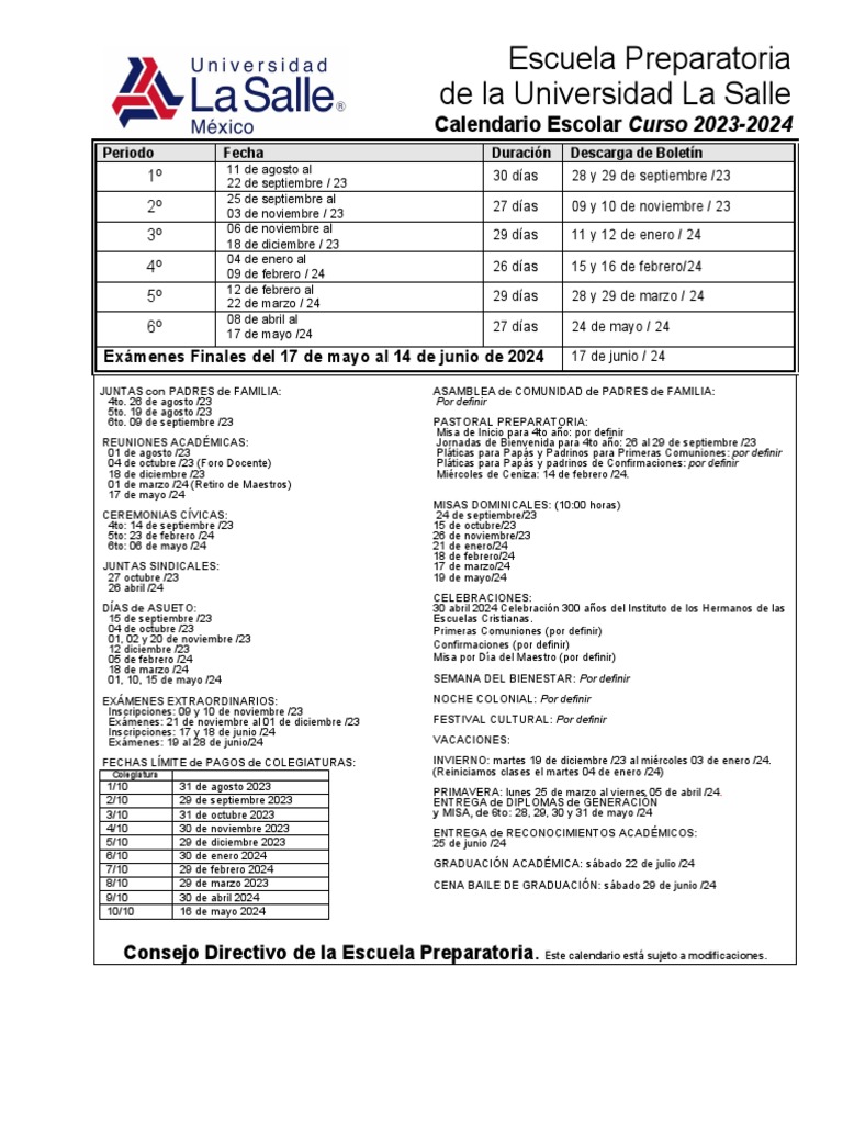 Consejo Directivo de la Escuela Preparatoria. Este calendario está sujeto a modificaciones.