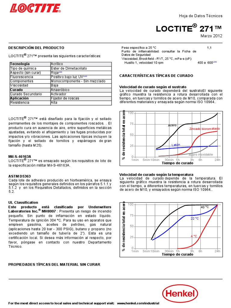 LOCTITE® 271™ presenta las siguientes características: Datos de Seguridad