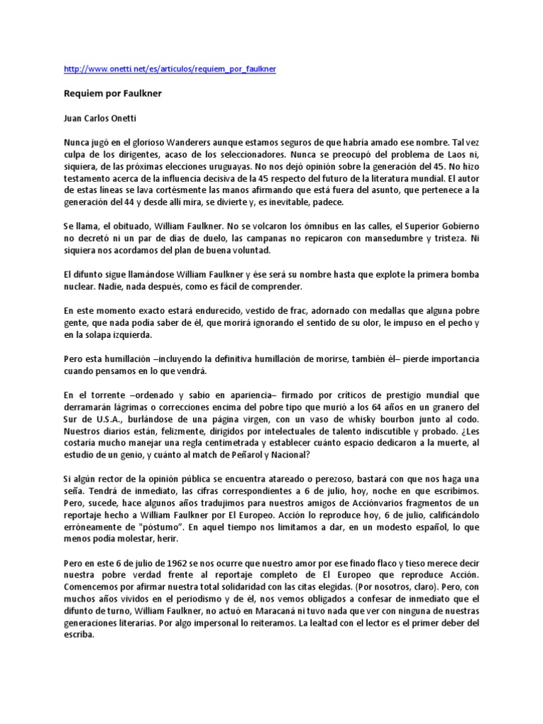Juan Carlos Onetti Nunca jug en el glorioso Wanderers aunque estamos seguros de que habra amado ese nombre. Tal vez culpa de los dirigentes, acaso de los seleccionadores. Nunca se preocup del problema de Laos ni, siquiera, de las prximas elecciones uruguayas. No nos dej opinin sobre la generacin del 45. No hizo testamento acerca de la influencia decisiva de la 45 respecto del futuro de la literatura mundial. El autor de estas lneas se lava cortsmente las manos afirmando que est fuera del asunto, que pertenece a la generacin del 44 y desde all mira, se divierte y, es inevitable, padece. Se llama, el obituado, William Faulkner. No se volcaron los mnibus en las calles, el Superior Gobierno no decret ni un par de das de duelo, las campanas no repicaron con mansedumbre y tristeza. Ni siquiera nos acordamos del plan de buena voluntad. El difunto sigue llamndose William Faulkner y se ser su nombre hasta que explote la primera bomba nuclear. Nadie, nada despus, como es fcil de comprender. En este momento exacto estar endurecido, vestido de frac, adornado con medallas que alguna pobre gente, que nada poda saber de l, que morir ignorando el sentido de su olor, le impuso en el pecho y en la solapa izquierda. Pero esta humillacin incluyendo la definitiva humillacin de morirse, tambin l pierde importancia cuando pensamos en lo que vendr. En el torrente ordenado y sabio en apariencia firmado por crticos de prestigio mundial que derramarn lgrimas o correcciones encima del pobre tipo que muri a los 64 aos en un granero del Sur de U.S.A., burlndose de una pgina virgen, con un vaso de whisky bourbon junto al codo. Nuestros diarios estn, felizmente, dirigidos por intelectuales de talento indiscutible y probado. Les costara mucho manejar una regla centimetrada y establecer cunto espacio dedicaron a la muerte, al estudio de un genio, y cunto al match de Pearol y Nacional? Si algn rector de la opinin pblica se encuentra atareado o perezoso, bastar con que nos haga una sea. Tendr de inmediato, las cifras correspondientes a 6 de julio, hoy, noche en que escribimos. Pero, sucede, hace algunos aos tradujimos para nuestros amigos de Accinvarios fragmentos de un reportaje hecho a William Faulkner por El Europeo. Accin lo reproduce hoy, 6 de julio, calificndolo errneamente de "pstumo. En aquel tiempo nos limitamos a dar, en un modesto espaol, lo que menos poda molestar, herir. Pero en este 6 de julio de 1962 se nos ocurre que nuestro amor por ese finado flaco y tieso merece decir nuestra pobre verdad frente al reportaje completo de El Europeo que reproduce Accin. Comencemos por afirmar nuestra total solidaridad con las citas elegidas. (Por nosotros, claro). Pero, con muchos aos vividos en el periodismo y de l, nos vemos obligados a confesar de inmediato que el difunto de turno, William Faulkner, no actu en Maracan ni tuvo nada que ver con ninguna de nuestras generaciones literarias. Por algo impersonal lo reiteramos. La lealtad con el lector es el primer deber del escriba.