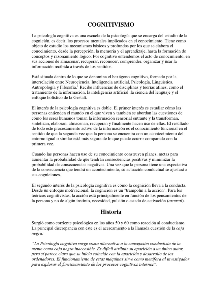 Surgi como corriente psicolgica en los aos 50 y 60 como reaccin al conductismo. La principal discrepancia con ste es el acercamiento a la llamada cuestin de la caja negra. La Psicologa cognitiva surge como alternativa a la concepcin conductista de la mente como caja negra inaccesible. Es difcil atribuir su aparicin a un nico autor, pero s parece claro que su inicio coincide con la aparicin y desarrollo de los ordenadores. El funcionamiento de estas mquinas sirve como metfora al investigador para explorar el funcionamiento de los procesos cognitivos internos.