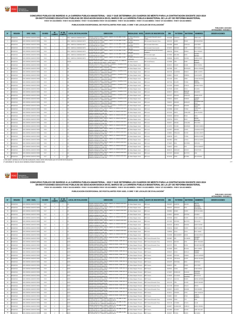 PUBLICACIÓN EXCEPCIONAL DE POSTULANTES POR UGEL O DRE Y DE LOCALES DE EVALUACIÓN
