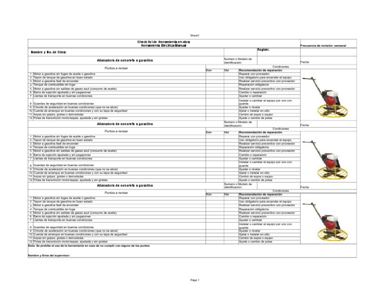 Allanadora de concreto a gasolina identificación: Fecha: