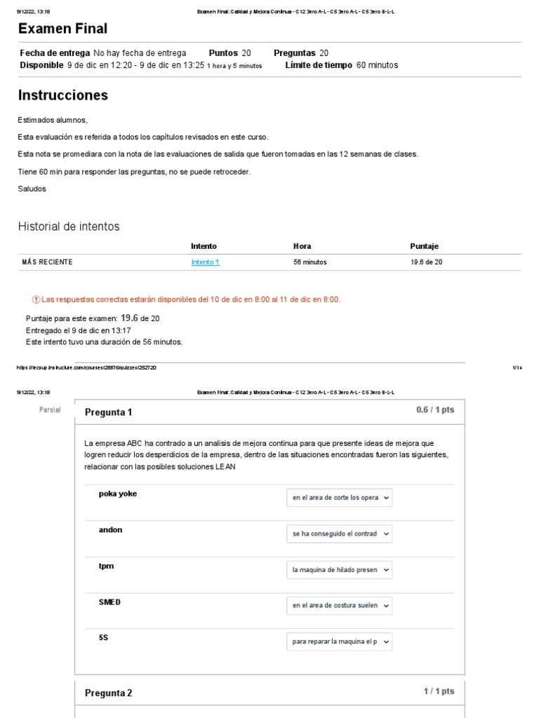 9/12/22, 13:18 Examen Final: Calidad y Mejora Continua - C12 3ero A-L - C5 3ero A-L - C5 3ero B-L-L