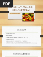 COMPONENTES ORGNICOS Hidratos de carbono Tienen una influencia fundamental en la calidad gustativa de los frutos. Son el origen de los azcares, que son el material de reserva del fruto y su fuente de energa. La cantidad de azcares oscila entre el 1-18% dependiendo de la especie y del estado de madurez del fruto. Los azcares ms importantes en los frutos ctricos son: glucosa y fructosa. cidos orgnicos Contribuyen conjuntamente con los azcares, a desarrollar la calidad gustativa y nutricional de un fruto. Desempean un papel importante en la vida de los frutos, siendo un factor de resistencia contra los hongos. Los cidos ms representativos en los ctricos son: ascrbico, ctrico y mlico. Lpidos Desempean un papel importante, en el control de la transpiracin y en la proteccin contra el ataque de parsitos. Se concentran en las semillas y en la cutcula, que es una fina capa que cubre la epidermis del fruto. Los lpidos ms conocidos son ceras y cutinas. Protenas El contenido en protenas de un fruto es bajo. Son importantes como componentes de las estructuras celulares y como constituyentes de enzimas implicados en el metabolismo del fruto. Pigmentos Son los elementos que producen la coloracin de los frutos. El color constituye uno de los factores ms atrayentes de los frutos y es debido a la clorofila y carotenoides. La clorofila nos da el color verde y los carotenoides las coloraciones roja y amarilla. Vitaminas Son elementos fundamentales para la dieta humana. Las vitaminas ms importantes son la A y la C y en menor proporcin las del grupo B. El contenido en vitaminas aumenta con el grado de maduracin de la fruta.