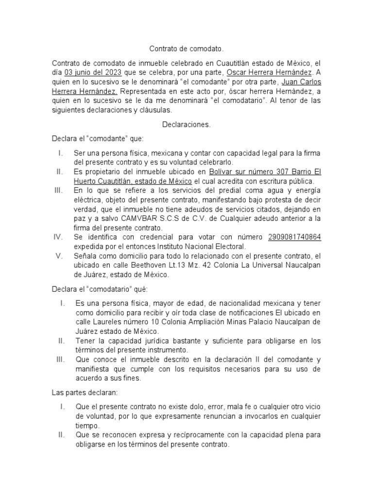Contrato de comodato de inmueble celebrado en Cuautitlán estado de México, el