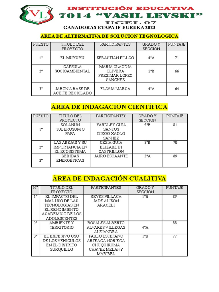 PUESTO TITULO DEL PARTICIPANTES GRADO Y PUNTAJE