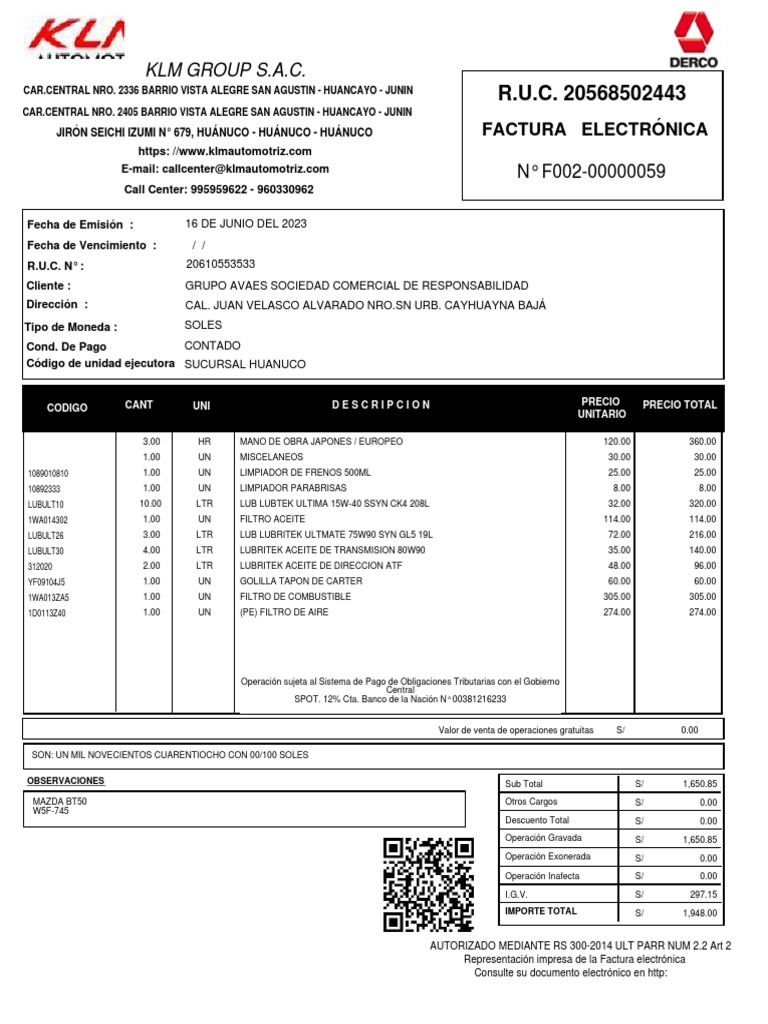 E-mail: callcenter@klmautomotriz.com N° F002-00000059